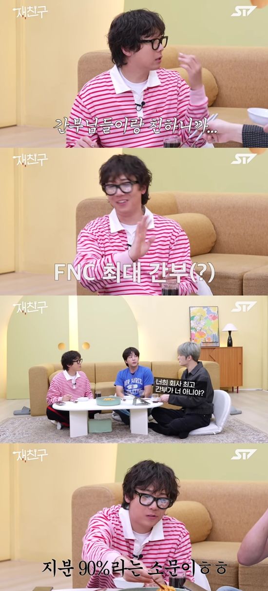 김재중은 "너네 회사 최고 간부가 너 아니냐"라며 "FNC는 이홍기 거라던데"라고 너스레를 떨었다. 장근석은 "지분 90%라는 소문이 있다"고 거들었다.