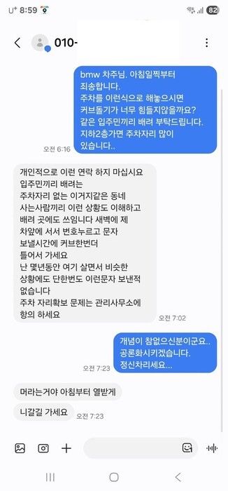 그러면서 “난 몇 년 동안 여기 살면서 비슷한 상황을 겪어도 (당신처럼) 이런 문자 보낸 적 없다”며 “주차 자리 확보 문제는 관리사무소에 항의하라”고 배짱을 부렸다.