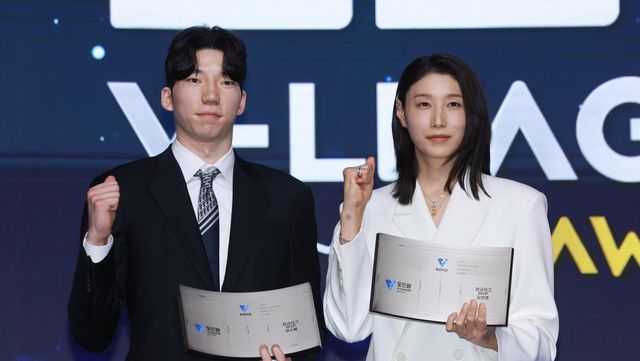 지난 4월 14일 서울 서대문구 스위스그랜드호텔에서 열린 프로배구 도드람 2024-2025 V리그 시상식에서 여자부 정규리그 MVP를 수상한 김연경(오른쪽)과 남자부 정규리그 MVP를 수상한 현대캐피탈 허수봉의 모습. / 연합뉴스