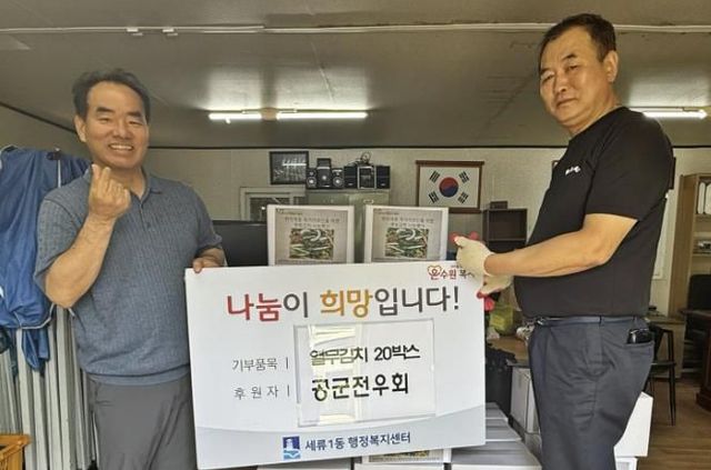 [와이뉴스] 수원시 권선구 세류1동 행정복지센터는 지난 18일, 대한민국공군전우회 수원지회로부터 취약계층 독거어르신을 위한 열무김치 20상자를 전달받았다.