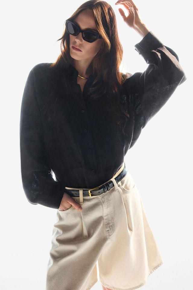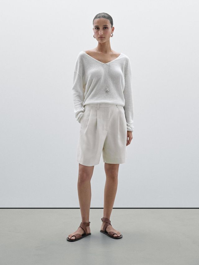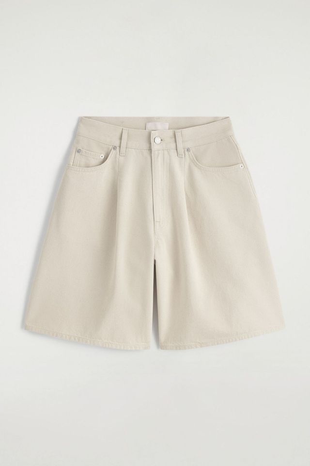 날씨 변덕이 심한 나라로 여행을 떠날 때도 이것만큼 요긴한 바지가 없습니다. 인플루언서 민주는 허리 부분에 주름이 크게 잡힌 버뮤다 팬츠를 워크재킷과 함께 입어 중성적인 느낌을 살렸습니다. 이렇게 주름 디테일 하나로도 완전히 다른 매력을 주는 게 화이트 버뮤다의 또 다른 장점입니다.