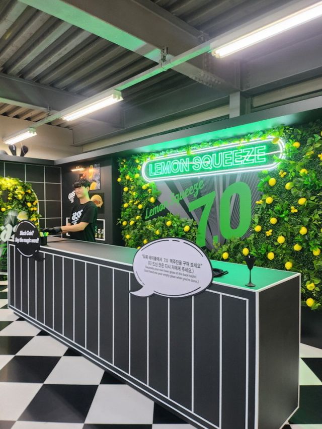 이번 팝업의 주인공은 바로 '카스 레몬 스퀴즈 7.0'. 기존 4.5도 제품에 비해 알코올 도수를 7도로 높인 이번 제품은, 레몬 과즙을 이탈리아에서 공수해 더욱 풍부하고 자연스러운 풍미를 완성했다.