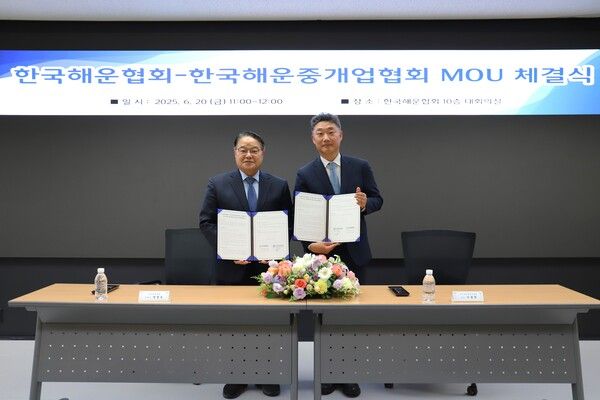 [뉴스락] 한국해운협회와 한국해운중개업협회는 한국해운협회 대회의실에서 ‘해운산업의 지속가능한 발전과 상생협력 강화’를 위한 업무협약(MOU)을 체결했다고 20일 밝혔다.