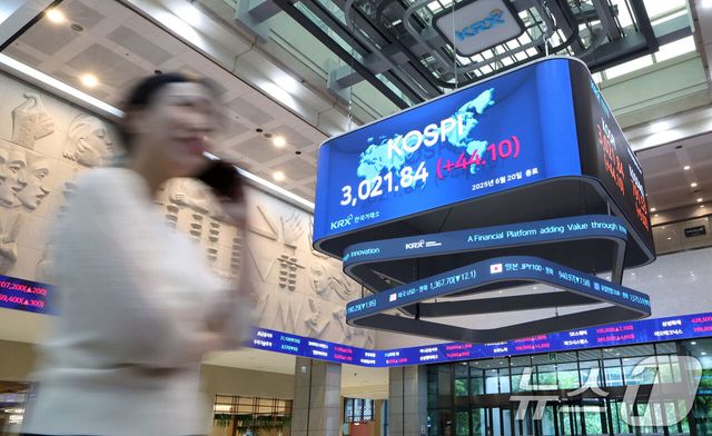 20일 오후 서울 여의도 한국거래소 서울사무소 마켓스퀘어에 코스피 지수가 전일 대비 44.10포인트(1.48%) 상승한 3,021.84를 나타내고 있다. 코스피가 종가 기준 3000선을 마지막으로 넘긴 건 지난 2021년 12월 28일(3020.24) 이후 4년 6개월여 만이다. (한국거래소 제공. 재판매 및 DB 금지) 2025.6.20/뉴스1