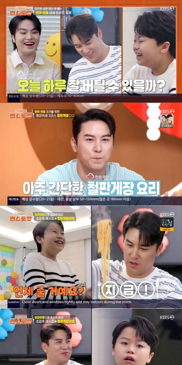 이날 방송에서는 만능여신 이정현과 주방의 신사 장민호의 유쾌한 요리 일상이 공개됐다. 그중 장민호는 황민우X황민호 형제를 초대, 호평 중인 호마카세 4탄을 선보였다. 리틀 싸이 황민우와 13세라는 나이가 믿기지 않는 폭발적인 가창력으로 사랑받는 황민우X황민호 형제는, 넘치는 에너지와 장난기로 삼촌 장민호를 쥐락펴락해 웃음을 자아냈다.