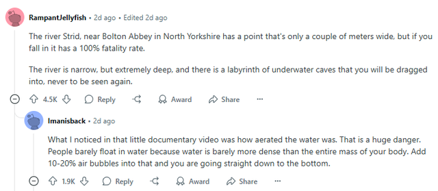 영국 노스요크셔의 볼턴 수도원 근처에 있는 스트리드 강은 폭이 겨우 몇 미터밖에 안 되지만, 한 번 빠지면 사망률이 100%에 달하는 구간이 있어. 강은 좁지만 엄청나게 깊고, 수중 동굴들이 미로처럼 얽혀 있어서 빠지면 그대로 휘말려 들어가 다시는 모습을 볼 수 없게 된다고 해.