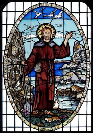 (성 커스버트가 그려진 스테인드 글라스. 발치에 아이더 오리가 있다. 동물을 사랑한 성인답게 그 외에도 많은 동물들이 그와 함께 그려져 있다.)