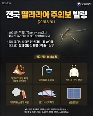질병관리청(청장 지영미)이 지난 20일 말라리아 주의보를 발령하고, 모기 물림 예방과 발열 시 적극적인 검사를 당부했다.