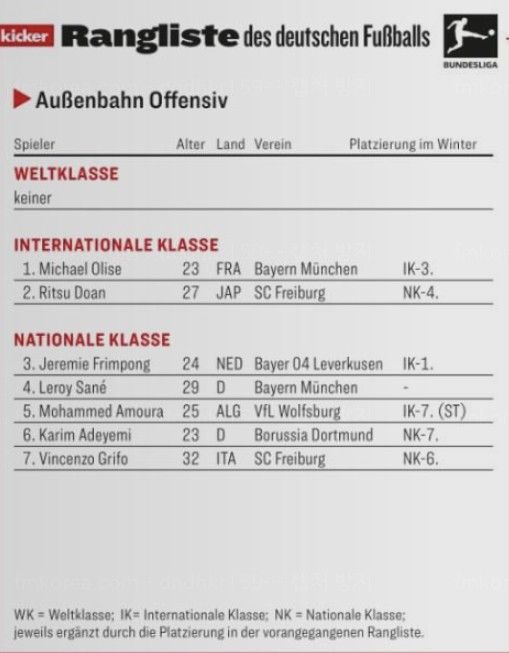키커는 2024-2025시즌 후반기 분데스리가에 월드 클래스 수준의 윙어는 없다고 평가했다. 1위엔 뮌헨에서 김민재와 한솥밥을 먹고 있는 올리세가 이름을 올렸다. 인터네셔널 클래스로 분류됐다.