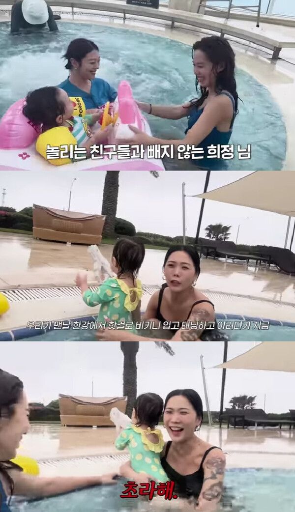 특히 허니제이는 딸 러브와 함께 수영장에서 물놀이를 즐겼고, 절친 배우 김희정이 합류해 흥을 돋웠다. 물놀이 도중 허니제이는 "우리가 맨날 한강에서 핫걸로 비키니 입고 태닝하다가 지금 이렇게 아기 안고 놀고 있다"며 과거를 회상했다. 이어 "우리가 입었던 수영복 중 가장 초라하다"고 솔직하게 고백하며 육아 현실에 대한 자조 섞인 유머로 웃음을 안겼다.