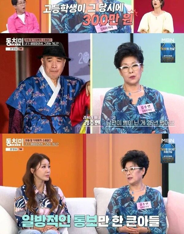 [메디먼트뉴스 김민기 기자] 원로배우 김희라의 아내 김수연이 남편에 대한 충격적인 폭로에 이어, 5년째 연락이 닿지 않는 아들에 대한 섭섭한 마음을 털어놨다. 6월 21일 방송된 MBN '속풀이쇼 동치미'에서는 '아들 키워봤자 소용없다'는 주제로 김수연이 파란만장한 가족사를 공개하며 안타까움을 자아냈다.