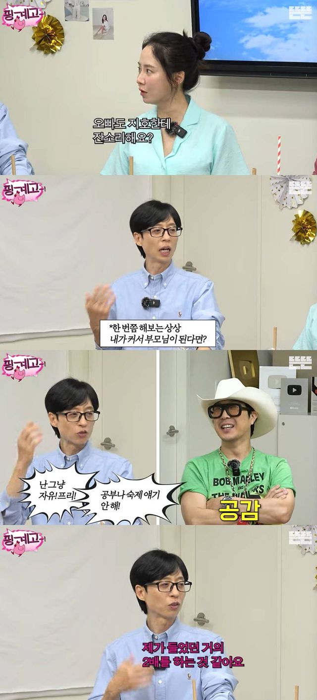 송지효는 이에 "오빠도 지호한테 잔소리 하냐"고 물었고, 유재석은 "당연히 한다. 나는 내가 어렸을때 나는 아이를 키우면 절대. 공부, 숙제얘기 안하려고 했는데 내가 했던 두배를 하는 것 같다"고 말해 눈길을 끌며 웃음을 안겼다.