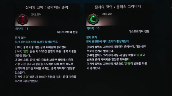 코어는 전투 경험 자체가 크게 변화하는 각종 옵션을 제공하며, 젬은 능력치 상승 효과를 제공한다. 코어의 경우 카제로스 레이드 4막과 종막에서만 획득 가능하며, 젬은 이들 외에도 가디언 토벌 등 다양한 콘텐츠에서 획득할 수 있다.