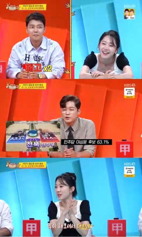 엄지인에 이어 도전한 김대호는 상대적으로 노련하게 개표방송을 해냈다. 엄지인은 "잘한다. 많이 해보셔서 다르다"고 말했다.