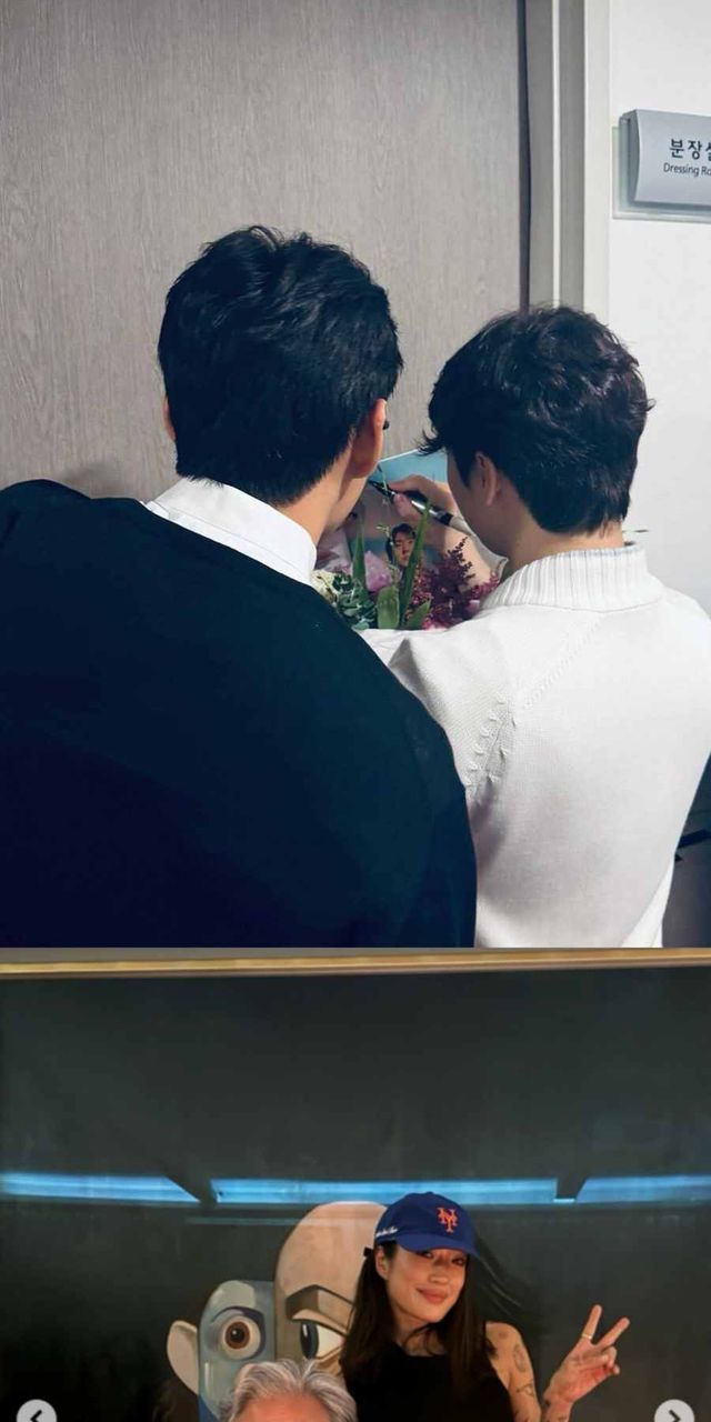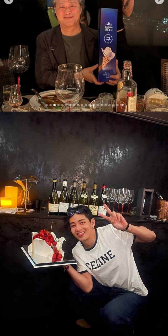 페기 구는 박찬욱 감독과 찍은 사진도 공개했다. 이 사진에는 뷔의 전역을 축하하는 케이크가 보인다. 지난 20일 뷔는 라이브방송에서 전날 전역을 축하해주는 사람들과 와인을 마셨다는 일상을 공유했다.