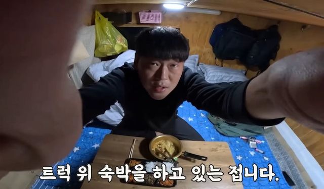 퇴근 후에도 콘텐츠는 끊이질 않는다. 조상하 씨는 트럭을 복층 구조로 개조하여 1층은 상점, 2층은 1평짜리 단칸방으로 만들었다. 직업 특성상 식비와 기름값이 많이 나오다 보니 “숙박비라도 아껴보자”는 생각에 만들게 됐다고 한다. 트럭 밖 조상하 씨는 시골 상인들과 티키타카 하는 재미라면, 2층 단칸방 속 조상하 씨는 먹방유투버 같다. 그것도 친근하고, 재미있는 ‘술친구’ 같은 유튜버 말이다. 라면 같은 간단한 요리는 직접 해 먹고 가끔 인심 좋은 시골 상인들이 음식을 나눠줄 때면 식탁은 풍성해진다. 전복밥, 홍새우, 제육볶음, 오징어 통찜 등을 먹으며 조상하 씨는 “이 맛에 장사하지”라며 술 한 잔을 기울인다.