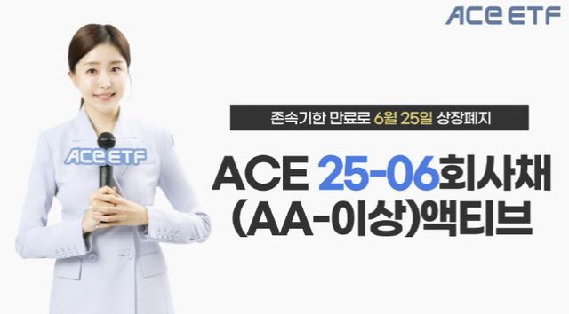 ACE 25-06 회사채(AA-이상)액티브 ETF의 해지상환금은 존속기한 만료일인 오는 27일 지급될 예정이다. 이를 위해 24일부터 해당 상품의 매매거래가 정지되며, 상장폐지는 25일 진행된다. 만기 이전 거래를 원하는 투자자들은 23일까지 매매를 완료해야 한다.