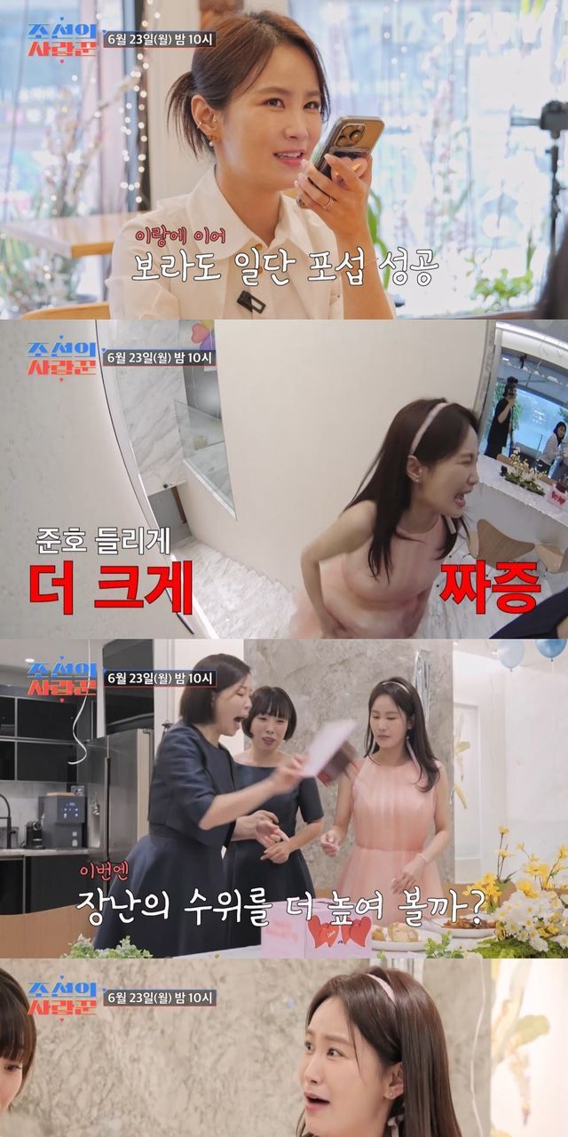 오는 23일(월) 방송될 ‘조선의 사랑꾼’ 선공개 영상에서는 ’예비 신랑‘ 김준호가 김지민의 절친 황보라·정이랑과 함께 신부를 위한 깜짝 ’브라이덜 샤워‘ 파티를 준비하지만, ’예비 신부‘ 김지민에게 이를 들킨 정황이 드러난다. 이에 김지민은 제작진에게 “원래 끝까지 모르는 척하려고 했다”고 하면서도, 정이랑과 황보라를 포섭해 ’역(逆) 깜짝 카메라‘를 계획했다.