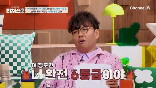 그러나 확인해 본 도전학생의 성적표에는 수학 4등급이 찍혀있었다. 정승제는 "태어나서 한 번도 본 적이 없다. 나머지가 1등급인데 수학이 4등급…희귀 성적표다"라며 경악했다. 그러나 앞선 모의고사에서도 이미 6등급을 받은 적 있는 도전학생에게 몇 가지 질문을 한 정승제는 "완전 6등급 상태다. 수능 4등급이 기적이다"라고 진단했다.