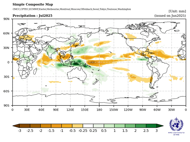 WMO 장기 예측 모델에서 조차도 7월 강수량의 적은 경향을 예측 중
