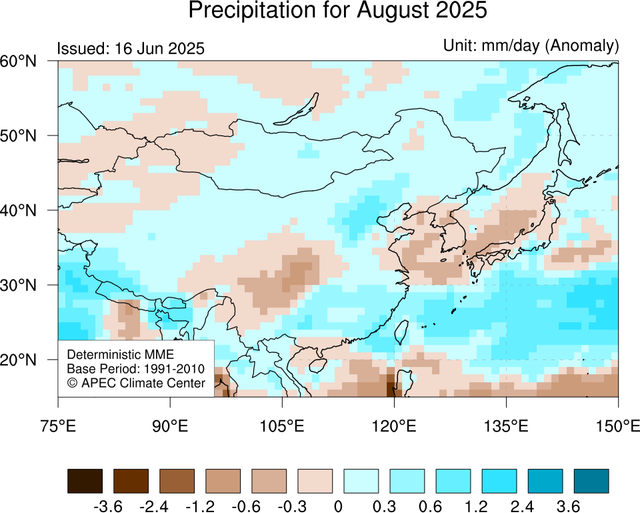 7월과 8월 모두 한반도 및 일본 지역에 강수량이 평년보다 적을 것을 예측 중