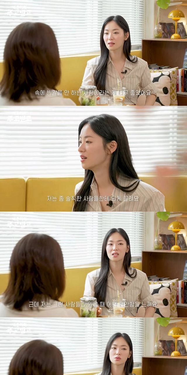 전여빈은 남궁민에 대해 "보자마자 선배님이 섬세하고 속에 빈말을 안 하는 사람이라는 게 좋았다"라며 "저는 솔직한 사람이라는 거에 끌린다. 저는 그런 사람들과 있을 때 편안함을 느낀다"고 말했다.