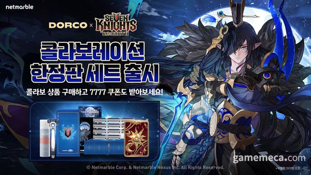 제품 구매 시 영웅 소환 이용권 7개, 펫 소환 이용권 7개, 픽업 영웅 소환 이용권 7개, 루비 700개가 포함된 도루코 X 세븐나이츠 리버스 7777 쿠폰을 증정한다.