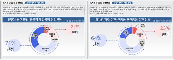 뉴시스 광주·전남본부와 무등일보, 광주MBC가 여론조사 전문기관 코리아리서치에 의뢰해 지난 20∼21일 광주·전남 지역민 1606명을 대상으로 지역 현안 인식조사를 벌인 결과, 광주 민간·군공항 무안 이전에 대해 광주 응답자의 71%, 전남 응답자의 64%가 "찬성한다"고 답했다.