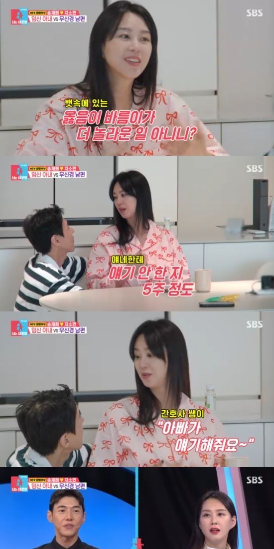 이에 지소연은 "뱃속 아기들한테 얘기를 안한지 5주가 됐다. 남편의 태담이 정말 중요하다. 근데 얘네들은 아빠의 목소리를 모를 수도 있다"고 서운해했고, 송재희는 "그거 뻥이래. 애아는 뱃속에서 아빠의 목소리가 안 들린대"라고 말해 모두를 함숨짓게 만들었다.