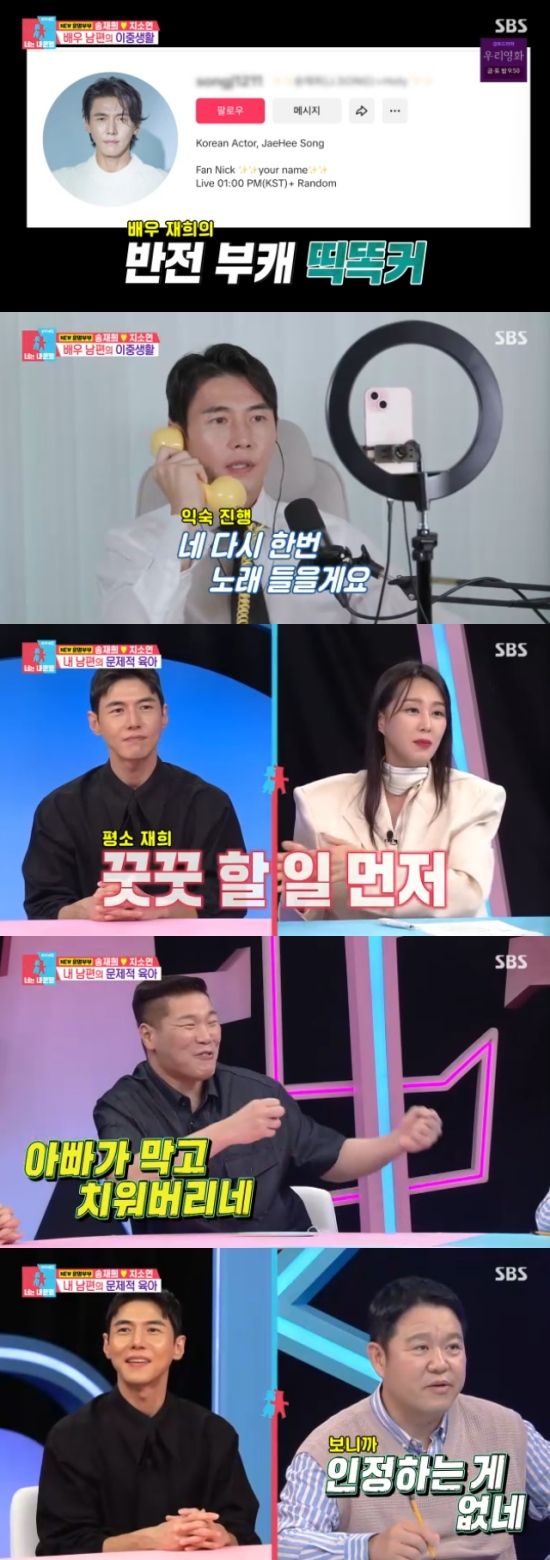 이날 송재희는 지소연과 딸이 자는 동안 아침부터 라이브 방송으로 팬들과 소통을 했다. 보여지는 이미지와는 달리 열심히 틱톡을 한다는 송재희는 자신의 라이브 방송을 시청하는 32명을 위해 열연까지 펼쳤다.