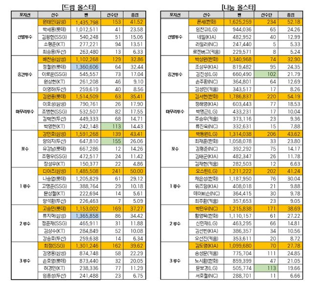 드림 올스타에서 팬심(心)과 '업계' 평판이 일치한 선수, 즉 두 부문 모두 1위에 오른 선수는 선발 투수 원태인(삼성), 마무리 투수 김원중(롯데), 1루수 르윈 디아즈(삼성), 3루수 최정(SSG), 유격수 전민재(롯데), 외야수 구자욱(삼성)과 빅터 레이예스(롯데) 7명이었다. 나눔 올스타는 선발 투수 코디 폰세(한화), 마무리 투수 김서현, 포수 박동원(LG), 1루수 오스틴 딘(LG), 2루수 박민우(NC), 유격수 박찬호(KIA), 외야수 박건우(NC)와 박해민(LG)까지 8명.