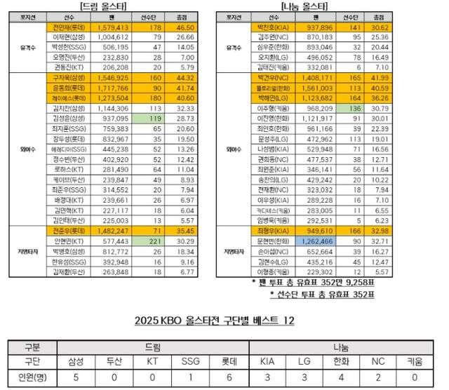 2025 KBO 올스타전 베스트12 투표에서 선수단 투표 1위에도 팬 투표에서 크게 외면당한 선수들이 있다.