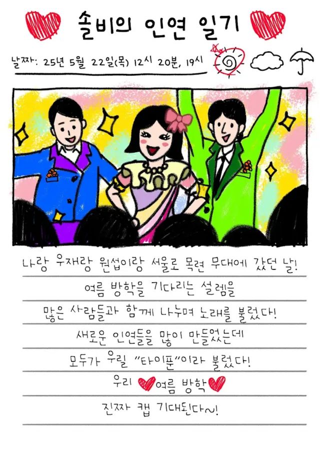 타이푼은 7월 11일 새 앨범 발매를 확정했다. 2017년 12월 그룹이 재결성된 타이푼은 2023년 9월 발표된 '왜 이러는 걸까' 이후 약 2년 만의 컴백을 확정하게 됐다. 이번 앨범에는 메인 보컬인 솔비를 비롯해 우재, 송원섭이 참여하는 것으로 알려졌으며, 한여름 컴백을 확정한 만큼, 시원한 곡을 들려줄 예정이다. 타이푼은 컴백을 앞두고 지난달 22일 서울로 7017 목련 무대에서 버스킹을 선사하며 분위기를 예열시켰다.