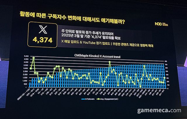 공식 GM과 별도로 버츄버를 커뮤니티 매니저로 활용하는 이유는 무엇일까? 그리고 버튜버 활동이 게임 이용자 증가와 같은 실질적인 성과로 이어졌을까? 이에 대해 24일 판교에서 열린 NDC 25(넥슨 개발자 컨퍼런스)‘에서 들어볼 수 있었다. 관련 내용은 넥슨 재팬 MS사업그룹 오주희 MS마케팅팀 리더와 스즈키 소우타 키노코짱 디렉터가 발표했다.