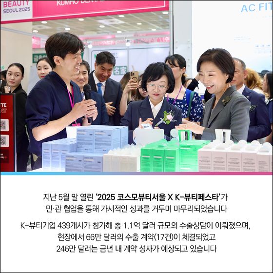 중기부에 따르면, 올해 '코스모뷰티서울 X K-뷰티페스타'에는 51개국 161개 사 바이어를 초청하고 K-뷰티기업 439개 사가 참여해 1억 1000만 달러 규모의 수출 상담이 이뤄졌다.