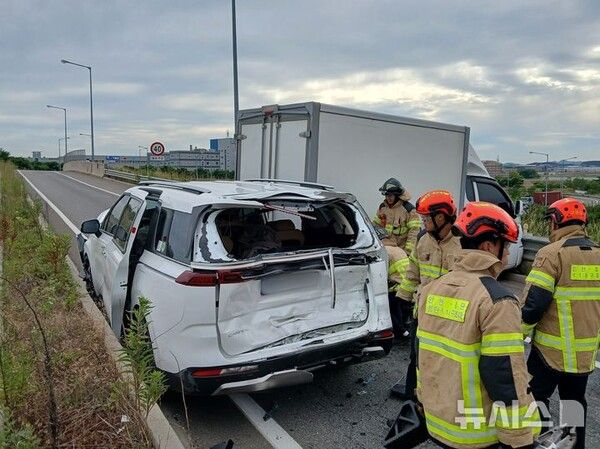 뉴시스 보도에 따르면, 24일 인천경찰청 고속도로순찰대 등에 따르면 이날 오후 4시5분께 인천 서구 인천김포고속도로 인천 방향 검단양촌나들목(IC) 진입부 램프 구간에서 A(50대)씨가 몰던 사료운반 화물차가 앞서가던 B(40대)씨의 카니발 차량 뒷부분을 들이받았다.