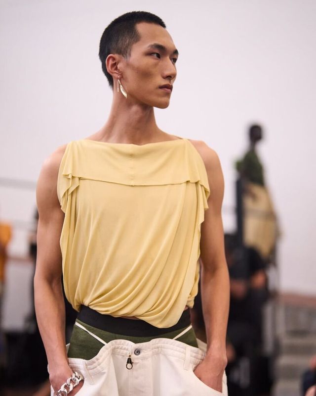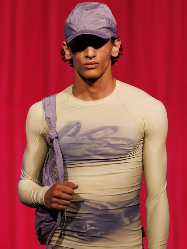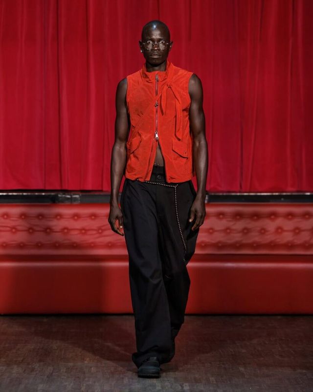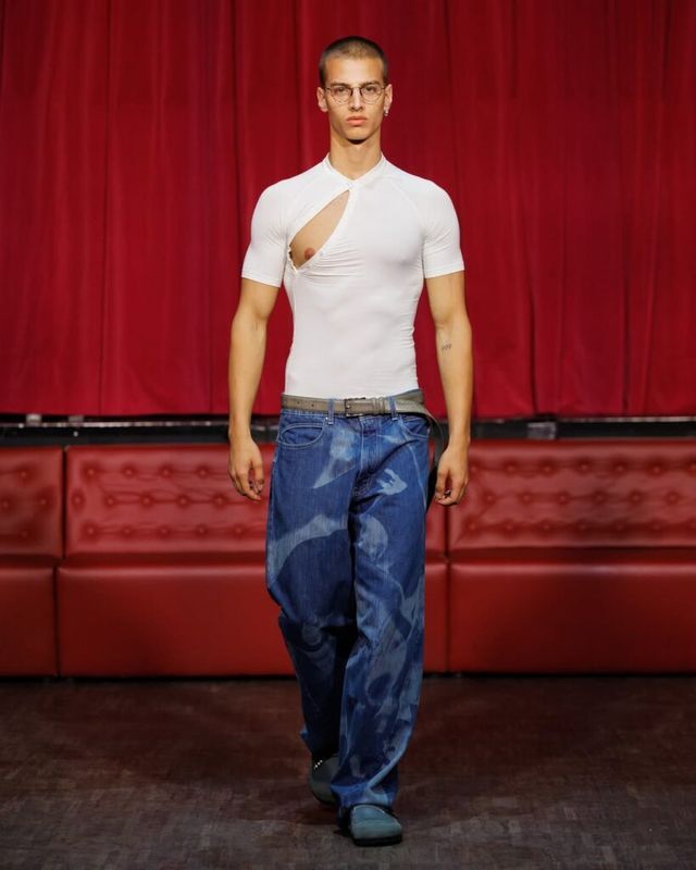 사울 내쉬(Saul Nash)는 ‘껴안는(Embrace)’ 행위에 초점을 맞춰 컬렉션을 펼쳤습니다. 허리와 가슴을 껴안는 듯한 프린팅과 보디콘셔스 실루엣의 톱은 해당 테마를 직접적으로 보여주는 아이템이었는데요. 신체를 과감하면서도 은밀하게 드러내는 컷아웃 디테일과 찰랑이는 소재감으로 남성의 관능미를 돋보이게 했습니다.