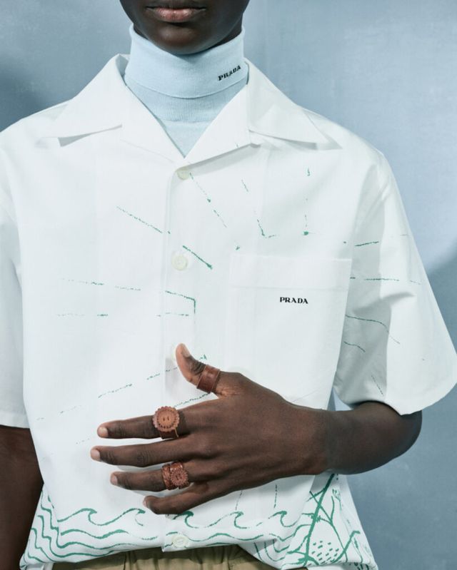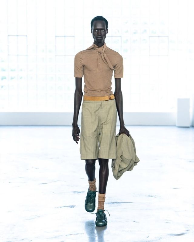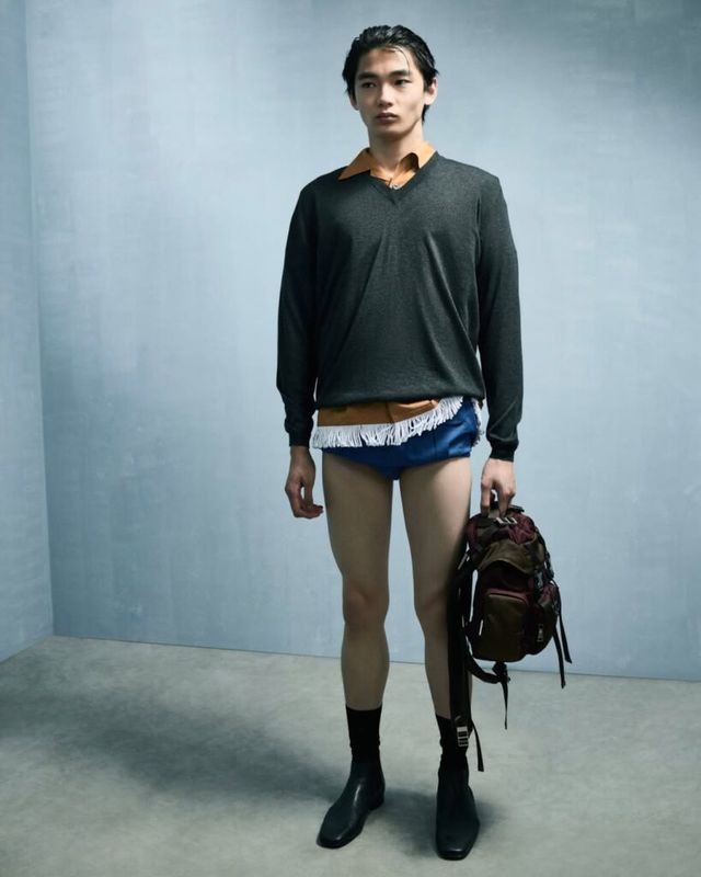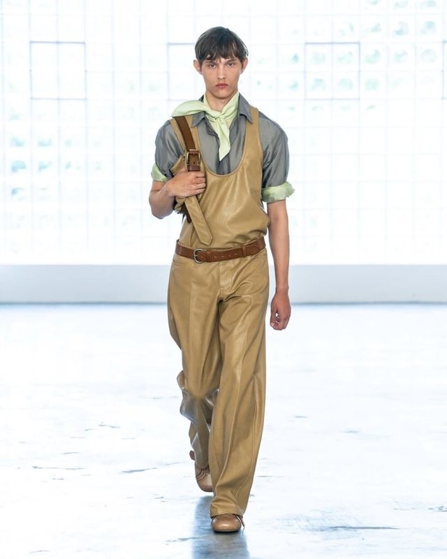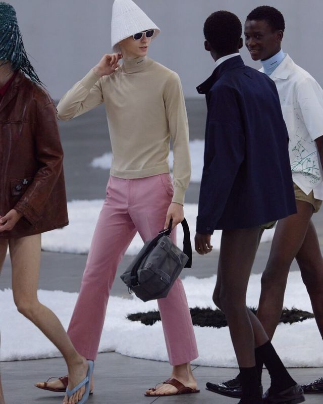 미우치아 프라다와 라프 시몬스의 프라다(Prada)는 전통적인 남성복이 가진 남성성을 해체하고, 이를 부드럽게 재해석했습니다. 아찔한 길이의 쇼트와 스키니한 핏의 트랙 팬츠는 머지않아 다가올 새로운 팬츠 트렌드를 예고했죠. 특히, 화분을 뒤집은 듯한 라탄 소재의 헤드피스는 런웨이 위의 강렬한 존재감을 드러냈습니다.