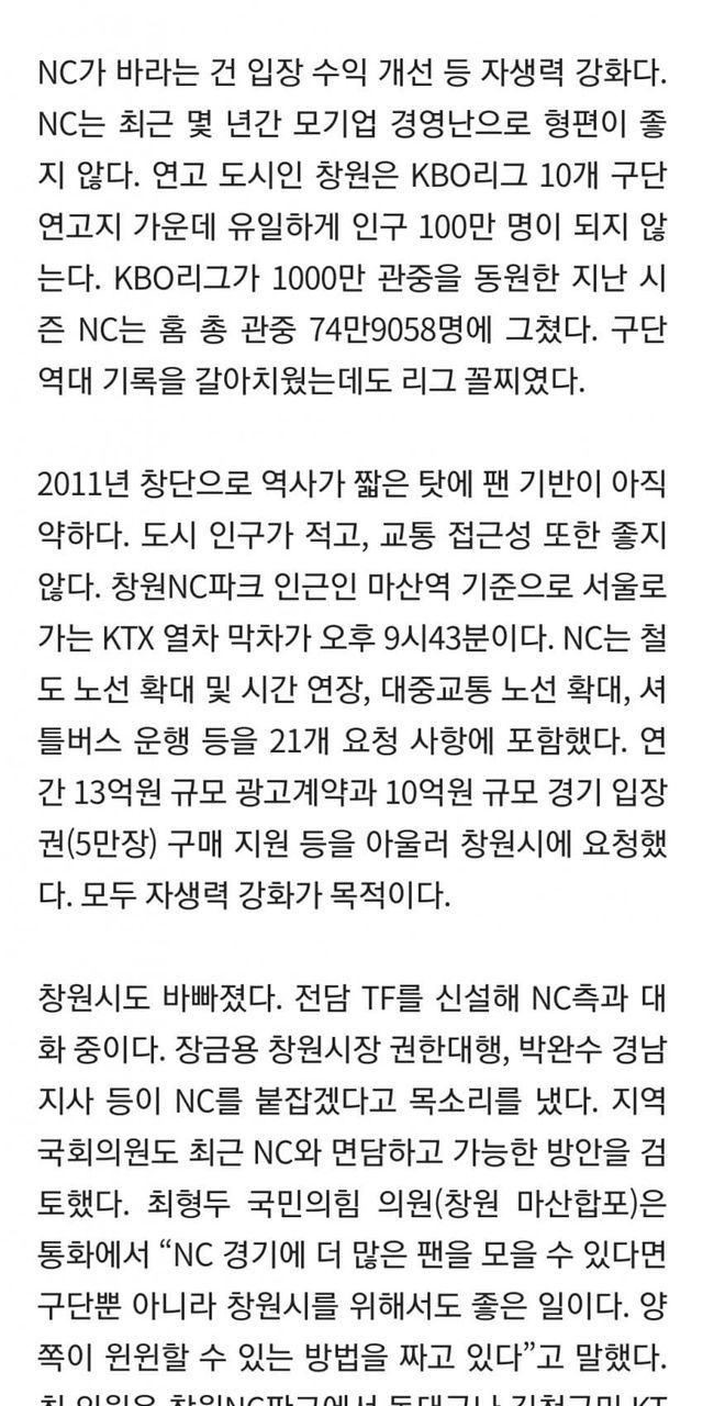 2. 시의원들한테 nc가 떠나면 어떡할거냐 면서 항의아 압박이 굉ㅎ장히 많이 하고 있는 상황이라고 함