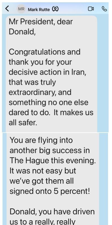 트럼프 대통령은 24일(현지 시간) 자신의 소셜미디어 트루스소셜에 뤼터 총장이 보낸 문자 메시지를 게시했는데, 그는 트럼프 대통령에게 "이란에서 보여준 단호한 조치에 축하와 감사를 드린다"며 "그 덕분에 우리는 모두 안전해졌다"고 전했다.