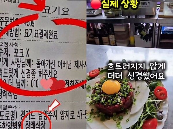 장례식장으로 육회를 주문한 한 손님의 요청 사항에 사장이 정성껏 음식을 만들어 배달한 사연이 알려지면서 누리꾼들에게 감동을 주고 있다.