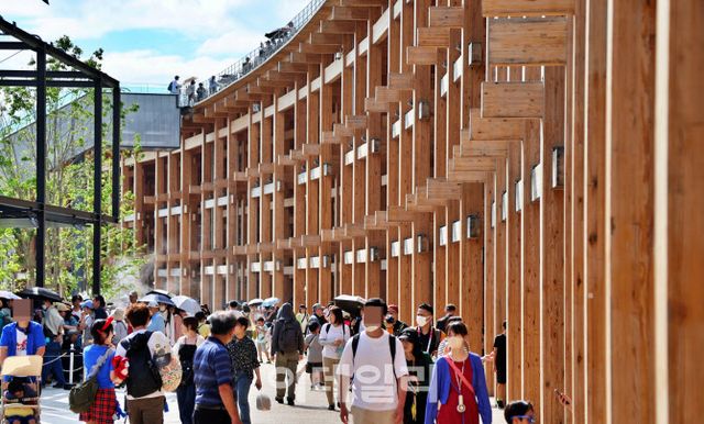 중심에 선 건축물이 오야네 링이다. 거대한 원형 목조 건축물. 공간 중심에 어떤 구조물도 없다. 모든 국가관, 기업관, 도시관은 링 둘레에 배치돼 있다. 중심을 없앴더니 오히려 흐름이 생겼다. 사람들은 자신만의 속도로 걷고, 멈추고, 바라본다. 공간은 동선을 만들고, 동선은 사유를 유도한다.