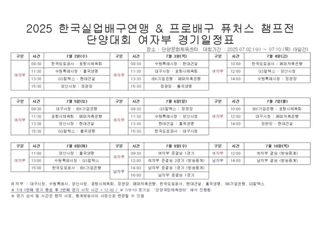 대회 개막일인 7월 2일 여자부는 단양문화체육센터에서 한국도로공사-포항시체육회, 수원특레시청-흥국생명, GS칼텍스-현대건설, 양산시청-정관장전이 열린다. 남자부는 같은날 단양국민체육센터에서 대한항공-부산시체육회, 영천시체육회-한국전력, 우리카드-현대캐피탈, KB손해보험-화성특례시청전이 치러질 예정이다.
