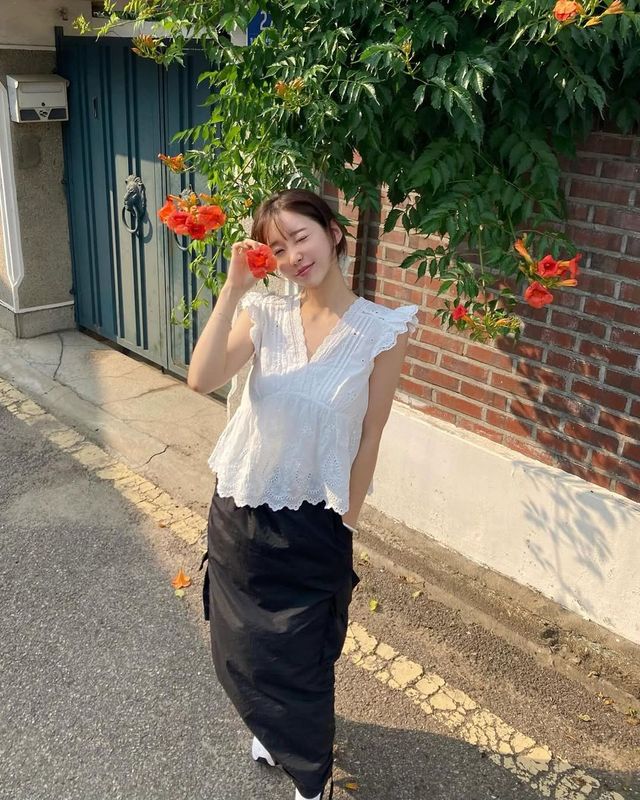 “민낯에 선크림만 발라도 이 코디라면 자신 있어!”라는 댓글처럼, 많은 팬들은 김윤희의 꾸안꾸 여름 스타일에 열광했다. 능소화 앞에서 브로더리 블라우스를 입은 그녀의 모습은 그 자체로 한 장의 엽서처럼 사랑스럽고 시원한 장면을 연출한다.