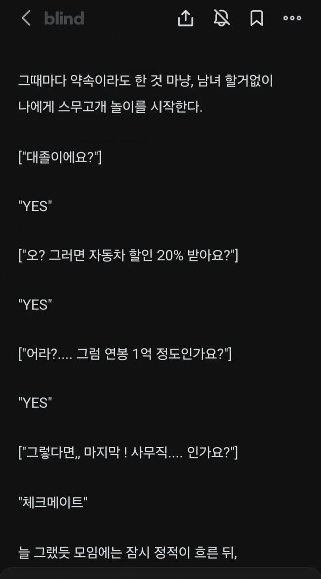 대졸이면서, 자동차 20% 할인이 가능하면서, 연봉이 1억인데도 사무직이라는 답변까지 이어지면, 잠시 정적이 흐른 뒤 여자들의 얼굴이 붉게 달아오르고, 남자들은 파랗게 질린다고 주장한다.