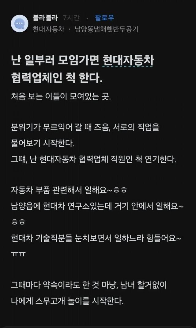 폐쇄형 온라인 커뮤니티 블라인드에는 최근 ‘난 일부러 모임 가면 현대자동차 협력업체인 척한다.’라는 제목의 글이 올라왔다.