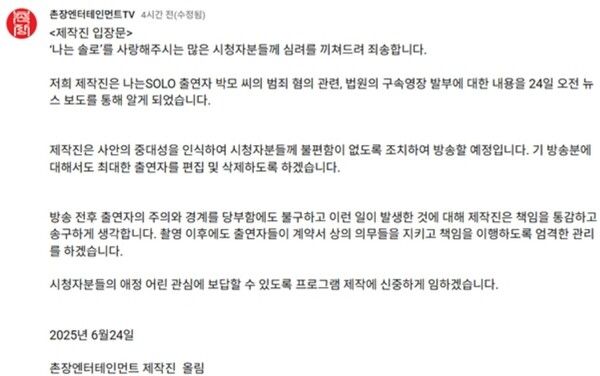 '나는 솔로' 제작진은 이번 사태에 대해 "출연자 A씨의 범죄 혐의 관련, 법원의 구속영장 발부에 대한 내용을 6월 24일 오전 뉴스 보도를 통해 알게 되었다"고 밝혔다. 이어 "사안의 중대성을 인식해 시청자분들께 불편함이 없도록 조치해 방송할 예정이며, 기 방송분에 대해서도 최대한 출연자를 편집 및 삭제하도록 할 것"이라고 강경한 입장을 표명했다.