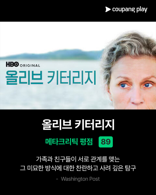 마지막은 전 세계적인 베스트셀러를 원작으로 한 ‘올리브 키터리지’다. 4부작 미니시리즈로 구성된 유일한 드라마 장르로, 메타크리틱에서 89점을 기록했다. 뉴잉글랜드의 한 마을을 배경으로 중학교 교사의 시각을 통해 인생과 삶을 섬세하게 그려낸다. 워싱턴 포스트는 “가족과 친구들이 서로 관계를 맺는 그 미묘한 방식에 대한 찬란하고 사려 깊은 탐구”라고 평하며 작품의 깊이를 극찬했다. 최우수 미니시리즈, 여우주연 부문 등 에미상 6관왕에 빛나는 ‘올리브 키터리지’는 할리우드 명배우 프랜시스 맥도먼드의 가슴을 울리는 명연기로 쿠팡플레이 시청자들에게 깊은 감동을 선사할 것이다.