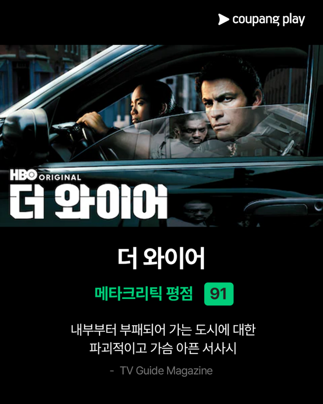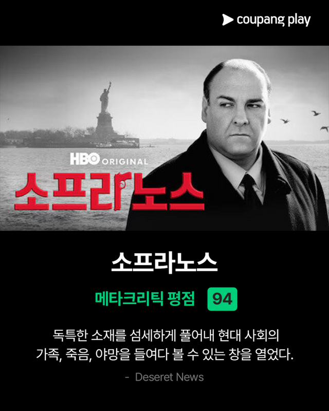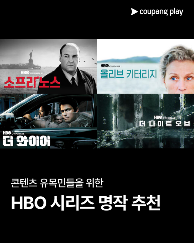 메타크리틱에서 높은 평점으로 완성도와 재미를 입증해 콘텐츠 유목민들을 사로잡을 미국 드라마의 수작 ‘소프라노스’, ‘더 와이어’, ‘더 나이트 오브’, ‘올리브 키터리지’는 오직 쿠팡플레이에서만 만나볼 수 있다.