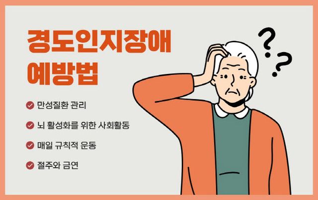 경도인지장애 예방을 위해서는 고혈압이나 당뇨와 같은 만성질환을 잘 관리하고, 정기적인 사회 활동을 통해 사람들과 소통하며 뇌를 활성화시키는 것이 필요하다. 매일 30분에서 1시간 규칙적으로 운동하는 것도 뇌세포 산화 손상을 줄이고 뇌 조직을 보호하는 데 도움이 된다. 음주와 흡연은 뇌 기능 저하에 악영향을 끼치므로 절주와 금연은 필수다. 특히 조기 발견과 치료가 중요한 만큼 가족력이 있거나 65세 이상 고위험군에 속하면 꾸준히 건강검진과 관련 검사를 받아보는 것이 좋다.